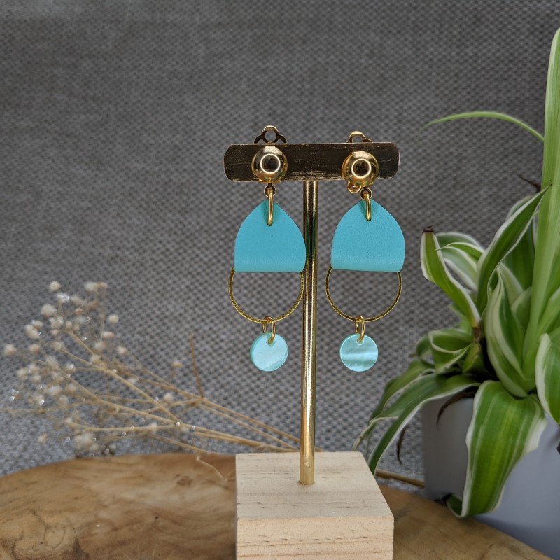 Boucle en métal doré ou argenté selon modèle, cuir et pastille de couleur.